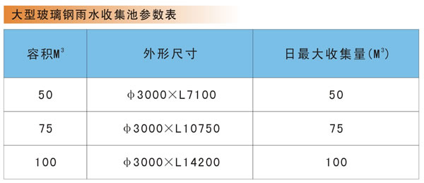 大型玻璃钢雨水收集池采用有机玻璃钢纤维、有机树脂等高强度耐酸碱材料一次缠绕成形,轻质高强,密封性好,永不渗漏。安装施工方便快捷,可用于各类建筑的雨水收集、消防水储备,节水环保。 产品规格同玻璃钢化粪池,有50-100立方多个型号可供选用,如容量超过100立方的可采用多个产品串联或并联的方式拼装使用。